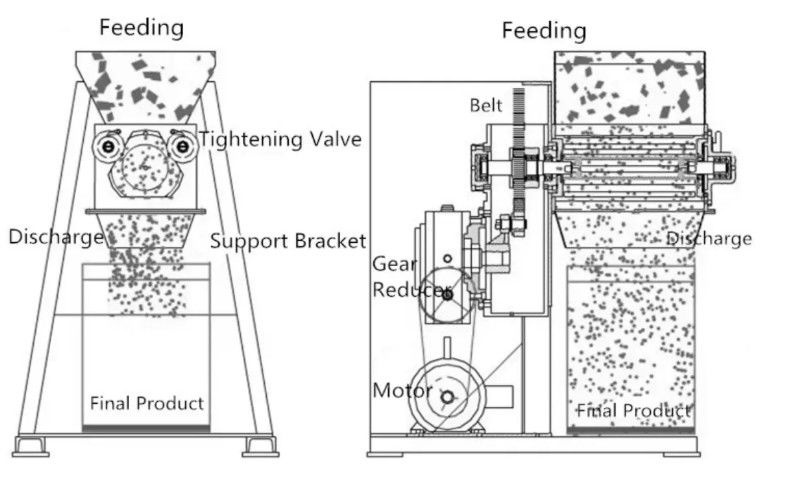 مبدأ العمل: يتأرجح الدوران بشكل متكرر من خلال ناقل الحركة الميكانيكي ، ثم يضغط على المادة أو يسحق المادة من خلال الغربال ، الذي يصبح حبيبات.