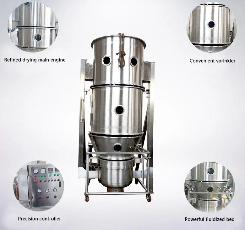 It is preheated and mixed with chen and heated air. از قبل گرم شده و با هوای چن و گرم مخلوط می شود. At the same time the solution of adhesive solvent is fogged and sprayed into the container. در همان زمان محلول حلال چسب مه شکن شده و درون ظرف پاشیده می شود. It makes the some particles become granulating that contains adhesive. این باعث می شود که بعضی از ذرات گرانول شوند و حاوی چسب باشند. Being of unceasing dry through hot air, the moisture in the granulation is evaporated and the adhesive is solidification. از طریق خشک شدن بی وقفه از طریق هوای گرم ، رطوبت موجود در گرانول تبخیر می شود و چسب در حال جامد شدن است. The process is carried out continuously. این روند بطور مداوم انجام می شود. Finally it forms ideal, uniform and Porous granules. سرانجام دانه های ایده آل ، یکنواخت و متخلخل را تشکیل می دهد.